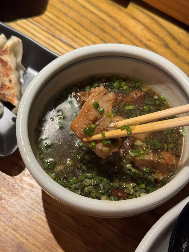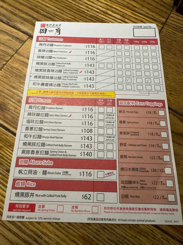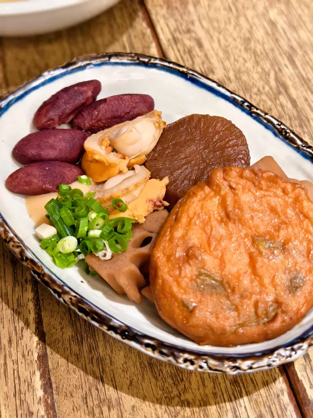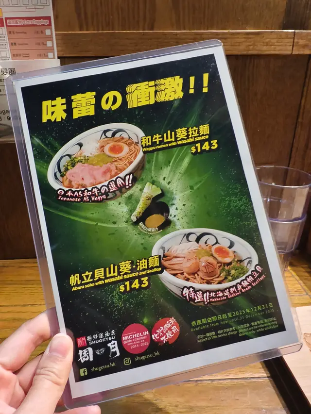 帆立貝山葵油麵$143燒黑豚味噌沾麵$143周月の餃子$46關東煮五點盛$82葡萄梳打$32白桃汁$32好味指數:😋😋😋😋抵食指數:💲💲💲💲環境舒適:😌😌😌😌環境衛生:🧹🧹🧹🧹服務質素:💁🏼♀️ 💁🏼♀️ 💁🏼♀️ 💁🏼♀️已來過這間米芝蓮拉麵🍜店多次,最近發現有期間限定拉麵,就來試一下。帆立貝山葵油麵用的是刺身級帆立貝,口感細膩、柔軟、彈性佳,味道鮮甜。除了帆立貝,另有清爽的芽菜、半隻溏心蛋🥚、提升整體香氣的蔥粒及鮮美的筍。麵是粗身的,有嚼勁,好掛汁。可以要求店員另上山葵醬汁。麵本身已拌入滿滿魚介味的醬汁。如果感覺吃膩了,可加點醋,中和魚介的味道。加入山葵醬汁後,味道變得更獨特,帶有清新又強烈的辛辣感。一不小心,就嗆到鼻,再直衝上腦,十分刺激。燒黑豚味噌沾麵的豚肉肉質爽彈,肥瘦均勻,吃起來不覺膩,並帶有微微焦香味。麵可以按個人喜好,選凍或熱♨️,亦可按食量,選100克,200克或300克。味噌湯不過咸。周月の餃子🥟皮薄,餡料juicy。關東煮🍢五點盛食材特別,與一般的不同。食材有蘿蔔、蓮藕、日本甜薯🍠、野菜魚餅、帶子,全部均吸盡湯汁。…查看更多