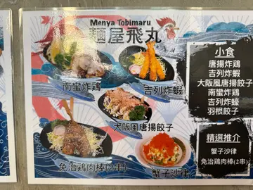有foodie介绍,都见网上评价几好,所以今日带埋阿妈黎面屋飞丸食下佢个拉面。2:00前去到见到几位学生食紧,座位唔多都系5-6张枱左右,我哋呢个平日时间唔驶排队直入。$90一个拉面正常价钱,鸡白汤拉面系主打,我叫盐味鸡白汤拉面,阿妈叫酱油鸡白汤拉面,面既硬度可以拣软/适中/硬,我拣软面,又真系软身啲岩我。个面黎到唔系热辣辣,但份量的确几够,👍🏼盐味同酱油鸡白汤底都各有特色,有鸡味,我钟意淡d所以喜欢盐味多啲,钟意浓味既人可以拣酱油。入面粒鸡肉丸几好食,入面有鸡软骨爽爽脆脆咁,粒味玉蛋因为我大肚所以冇食,冇得评价,我妈话ok。鸡胸肉同猪肩肉只系室温既温度,我冇追问店家系咪专登要整室温唔热,因为系慢煮出黎既肉,好滑唔鞋,但略欠肉的香味,一般般,我钟意煎香既肉同埋热d。加小食送野饮,我哋加左大阪风唐扬饺子,入面个馅有粟米🌽同似系鸡软骨丸既馅,几特别㖞,上面铺满木鱼同沙律酱,好大粒饺子,几好食。蟹子沙律我妈食既,我见佢食到爽爽声,同埋好大碗好多蟹籽,应该都正常发挥👍🏼。野饮因为铺头冇位冲,所以只有汽水或者支装雀巢柠檬茶或波子汽水饮。如果d肉热返d,同埋猪肩肉有煎香既话我会再黎食过,因为个汤底同面质系几好食。