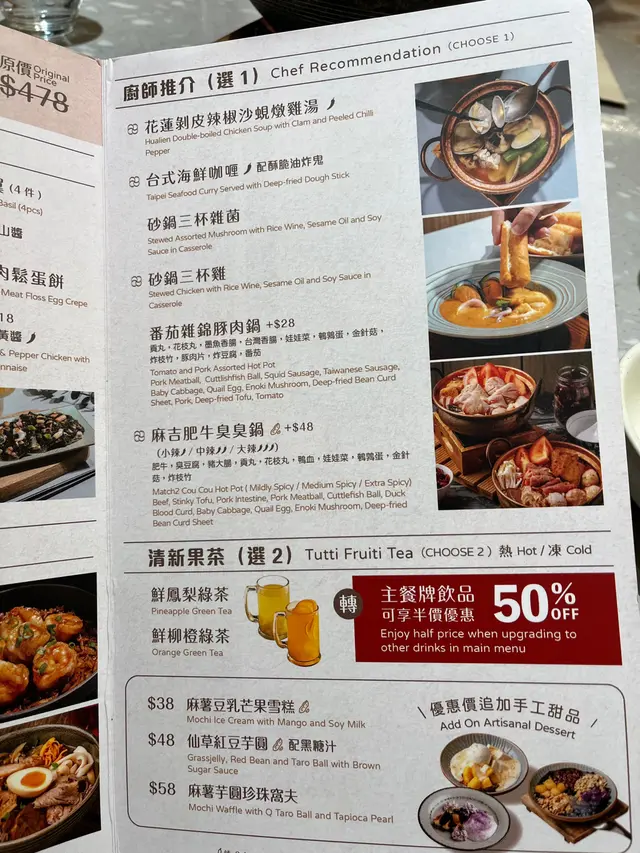 呢間餐廳位於尖沙咀,連住尖沙咀地鐵站D3出口好方便!裝潢走文青風格,木系桌椅搭配暖色燈光,氛圍輕鬆~ 今次我坐卡位,拉埋布簾即刻變咗個小包廂,私隱度up ! 好適合朋友或情侶小聚🥰今次我叫咗佢嘅「推介二人餐」,都幾抵食~人均只喺百幾蚊,我同朋友食都食到好飽呢~⭐️推介二人餐⭐️💰358👉🏻夜市小食:麻吉 Griddle(牛肉夾饃)🧇餐廳最新推出食品!外層窩夫皮好香脆,帶啲牛油香同甜味,牛肉口感扎實,咬落去一次過有齊鹹同甜嘅味道,幾特別、個味道又幾夾喎~佢有分開兩件同用紙袋裝住,方便食又方便同朋友share👍🏻份量都幾大,推介💗👉🏻飯麵主食:鹽酥雞配麻婆豆腐蓋飯🍚鹽酥雞炸得好好味!唔會好油膩,外脆內嫩,有台式胡椒香~ 而麻婆豆腐小辣微麻,豆腐滑嫩,送飯一流~👉🏻廚師推介:花蓮剝皮辣椒沙蜆燉雞湯🍲份量足夠2個人share (每人啱啱好2碗);湯底清甜,蜆的鮮味和雞肉的油香配合得不錯~湯入面都放咗香菇,所以個湯飲落都好重菇味~而剝皮辣椒帶微辣,飲落個感覺好暖胃😋,好適合而家凍凍地嘅天氣👉🏻手工甜品:麻吉芋圓愛玉配黑糖🍨芋圓煙煙韌韌,愛玉清爽解膩,黑糖甜度適中~配上雪糕、紅豆、珍珠、菠蘿,整體口感層次豐富,喺一款經典又好味嘅台式甜品~👉🏻餐飲:熱鮮鳳梨綠茶🍍:茶香清新,鳳梨果味自然,熱飲帶出果酸香氣凍鮮柳橙綠茶🍊:柳橙味清甜,同綠茶嘅味道好夾!(飲品如果想要少冰少甜都可以同店員提出啊~)呢間餐廳環境舒適,整體嚟講cp值高,食品質素有保證又啱打卡👍🏻掛住台灣美食嘅你值得一試!…查看更多