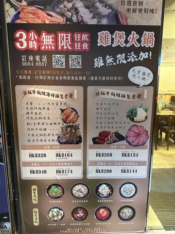 餐厅主打海鲜鸡煲套餐,无限加鸡。另设有特色汤底,绝无味精,用心烹调。另外可以无限添加指定食材。除此之外亦设有定价相宜的午市火锅放题。