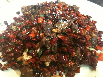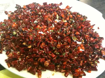 3分.辣子鸡 (大辣; 见上图): 呢碟菜我地无叫到最辣, 系想用佢同之后上台o既水煮牛肉(最辣) o既麻辣度作一比较. 上台时睇到的鸡都几大件, 辣椒同鸡o既份量大约系一般川菜馆o既7:3之比. 配料除红辣椒同辣椒干之外有腰果、葱、仲有… 咦, 花椒呢? 点解又系无o左最重要o既材料o既? 我地于是好似打war game咁以地毯式搜索, 依然系毫无结果, 花椒踪影杳然.