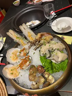 深水埗食好西,今次特登来食抵食既海鲜蒸汽火锅🍲,新鲜好食抵食,第一次试已经超级推荐👍究竟$368蒸汽海鲜餐一位有咩食:定食一拣左日式刺身拼盘定食二拣左生猛龙虾🦞粥底3选1 就选择瑶柱淮山粥自选海鲜四款:生猛大元贝,苏格兰圣子皇,生猛鲜鲍鱼,优质桶蚝🦪主打以上必食蒸汽海鲜放题配料特别推荐顶级美国🇺🇸肥牛,超级好食🤤食劲多仲有点左手打手肉丸,手打墨鱼丸,莲藕片,甜玉米,姬松茸蒸鸡等等,超级丰富另外饮品也任饮,喜欢食海鲜蒸汽火锅就要试下啦。