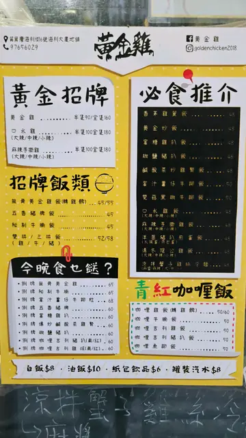 这是一间在内街的小店,看似是家庭式作业,店舖细少,但仍然有小量堂食空间。进食其间,绝大部份的客人都是点外卖,我们实属极少数的堂食客。这类黄油鸡以其原汁原味、色香味俱佳为特点。烹饪方法虽然看似简单,但还是要用心地去操作,才能制作出口感细腻、口味浓郁的黄油鸡,给人带来美丽的味觉体验。小店的厨房内有著一只只金黄色的挂鸡,没有理由不点此店最经典的菜色。见餐牌内有猪脾饭,想起不是很多地方有,便也点了这个。衬等候食物上枱其间,四处望望,原来也有自家包的饺子,口味甚独特。饮品也不是一般的选择。有趣~两盒满满、以纸盒装上的饭到了,还奉上两杯例汤。例汤原来是鸡汤,味道不算太鲜浓,但既是跟餐赠送的,没有太大要求。无骨黄金鸡饭,口感鲜嫩,在鸡的鲜味上却不算很高。但丰富的配菜,浓厚的酱料伴衬下,还是有一定的满足感。这五香猪脾饭还不错的,猪皮部份入口即化,猪肉也煮得非常入味柔软,也挺喜欢的。有点意犹未尽,立刻再加两份小食。避风塘薯角,这种配搭不常见,却又效果不俗,松脆爽口,但也感觉挺热气的,二人分一个细盒已是刚刚好,不能贪吃~脆卜卜鸡软骨,确是脆卜卜的,也用上很香浓的香料作配,很快又吃清光了。…查看更多