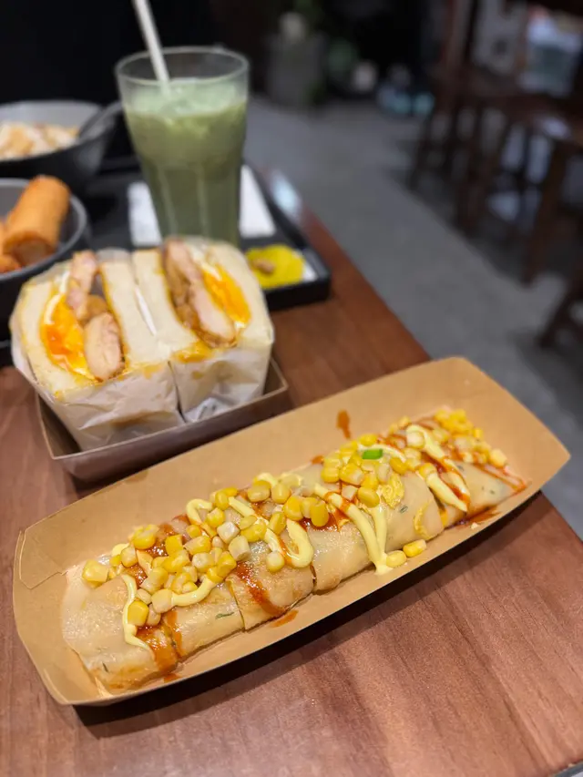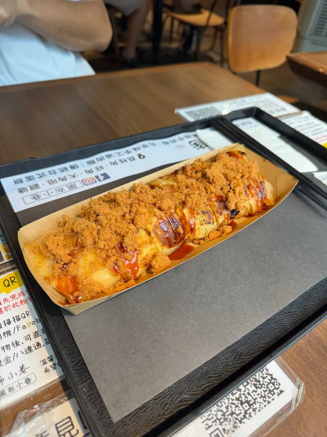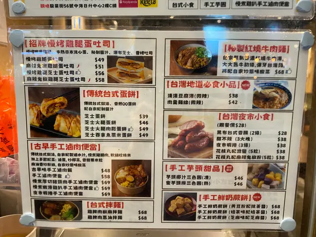 ;火腿、肉鬆帶著鹹香,三者味道好搭。蛋餅皮煎至薄脆,配上醬油膏,更貼近台灣地道風味。