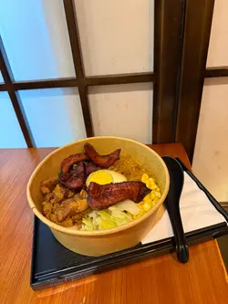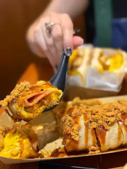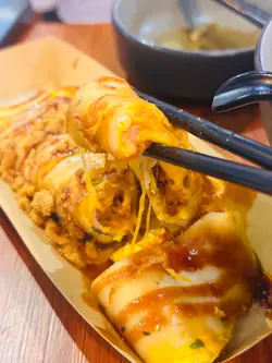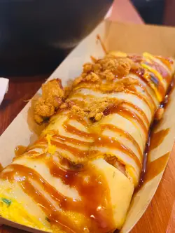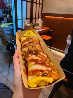 有日經過荔枝角《黑布小巷》見到大排長龍,見個蛋餅好吸引,不過當時趕時間就暫援咗。今日喺旺角見到有分店!可能過咗食飯時間,俾我見到店入面有位,就嗱嗱聲入去霸枱。雖然差不多九點,但都仲滿滿地客。我一坐低第一時間柯打咗:芝士火腿肉鬆蛋餅🍳 $49- 蛋餅果然冇令我失望,半溶拔絲邪惡芝士、配火腿肉鬆,口感同味道都好有質素手工滷肉便當🐖 $58 加台灣腸🫘 $28(跟餐)- 便當有滷肉、酸菜、滷蛋、粟米同菜,滷肉係台灣地道嘅味道,亦唔係肉碎係肉叮。台灣腸亦都熱辣辣非常好食。跟餐飲品:黑糖紅棗桂圓薑茶☕️ $16 黑糖蘋果紅棗薑茶☕️ $16- 雖然係黑糖系列,估計因應咗港人甜度,黑糖/紅棗/桂圓/蘋果/同薑味都飲到。港女表示很好唔太甜。見到隔籬枱個吐司咁靚又實在忍唔住嗌咗:慢烤雞腿蛋吐 🥪 $49- 雖然個芝士蛋吐司好吸引,但之前個蛋餅令人好滿足,所以就簡單加咗個雞腿吐司。烤雞腿醬好香,吐司個麵包都炕得剛剛好。加吐司時我地再加咗個甜品冰火湯圓 🍨 $38- 顧名思義係熱辣辣嘅湯圓、用冰鎮住上,冰上仲散有陣陣桂花香氣。小店人情味滿分,性價比高。期間啲客人一路都出出入入,舖頭都幾多人。大件又抵食😋…查看更多