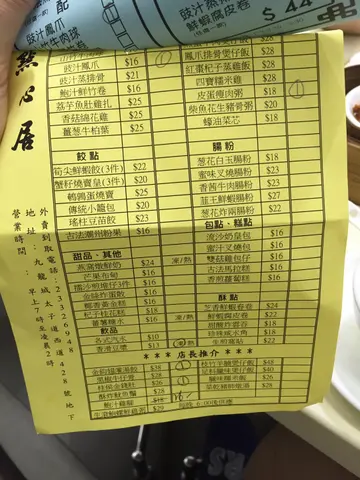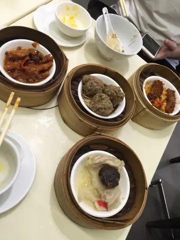 是夜去到九龙城,觅食,2口子也想吃点心,于是乎就拣一间坐下🙂坽住张点心纸⋯突发觉无咩特别野,也没有什么特别啱吃🤔结果简左以下几款⋯⋯ 菜芯→无唛味但不老,太淋,要靠蚝油。 鱿鱼须→哗!少到呢…………连沙律酱都唔多!无味个外皮又不够香不够酥不够脆!零质感,仲话店长推介,唔好信🙄 菜苗饺→皮好薄,豆苗嫩份量又多,够味! 芝香鲜虾春卷→吃不到所说的芝士,馅少脆皮多⋯⋯ 还好在不油腻,但作为店长推介未免有点不够实力…… 叉烧肠→超多芫茜,皮不算太滑。 鲜竹卷→本有期待,佢话鲍汁⋯⋯但唔觉有,整体好干,馅不好吃。 烧卖→好怪!无食过咁难吃的烧卖⋯⋯好硬好干😖 排骨→都算合格,比其他野ok⋯⋯ 本来见佢开左有几年是抱有期待的,可惜食了2个店长推介都实力欠奉……真心失望……