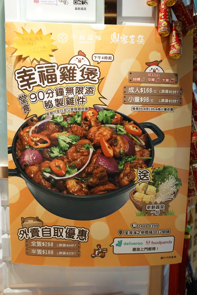 天氣突然驟降,食熱辣辣惹味雞煲啦我地去左屋企附近既商場荃灣海之戀搵食見到《鼎家喜筷》推出左90分鐘無限添加幸福雞煲🍲可以「無限添加」秘製雞件 同免費加湯底打邊爐 隨附新鮮「新鮮蔬菜籃1份」幸福雞煲有三種辣度可以選擇BB辣🌶中辣🌶🌶大辣🌶🌶🌶我地揀咗BB辣。雞煲以麻辣的雞煲醬調配配埋洋蔥、芫荽、辣椒而成非常惹味。🐥雞件每件都好新鮮好厚肉,肉質滑嫩。另外可以加錢添加丸類,蔬菜食到差唔多就可以加湯打邊爐了。我地額外加左珊瑚蚌和午餐肉同生菜。。蔬菜籃:冬菇,金針菇,粟米,娃娃菜份量好多同新鮮烏冬吸收晒雞煲既精華,非常入味。可以加每位$28無限任飲自家製清熱特飲-菊花薏米/檸檬洛神,大大樽,味道不甜夠清熱氣另外呢度除左中式小菜雞煲外,仲有甜品可以食,下次可以試下其他先。🍽鼎家喜筷📍地址:荃灣大河道100號海之戀商場3樓3012號舖#鼎家喜筷 #幸福雞煲 #新鮮蔬菜 #菊花薏米 #雞煲 #火鍋 #海之戀 #荃灣美食 查看更多