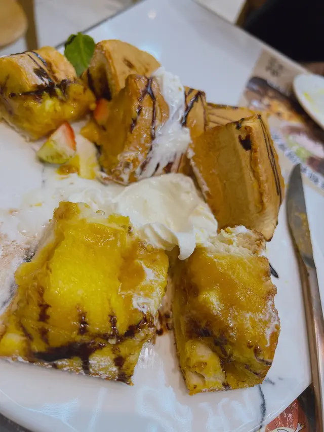 今日去左荃灣海之戀商場嘅鼎家喜筷食下午茶。今日是年初四的假日,仍然有下午茶餐,但我散叫了燒味夾饃雙拼,脆香蜜糖吐司配5.0牛奶雪糕同埋熱田園水果茶。燒味夾饃的包饃很軟熟,一件夾叉燒,另一件夾燒鵝,仲有片青瓜,味道及口感不錯。至於吐司差不多有2吋高,份量十足;水果茶也很清甜,埋單連加一合共$187。查看更多