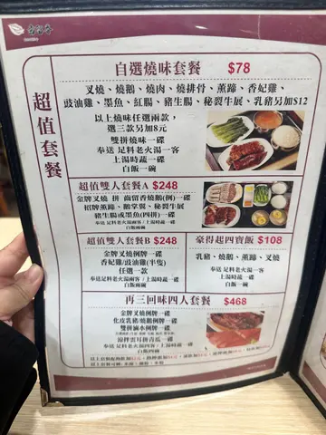 听讲烧味叉烧好出名,见外卖平台可以嗌就点左个五宝饭配可乐六十几蚊送到黎一打开真系吓亲劲大盒,全个底都系饭之余D烧味仲铺满左成个饭有烧鹅、叉烧、熏蹄、红肠、咸蛋个人认为60零蚊有咁多𩠌,性价比都几高🫶🏻🫶🏻烧鹅 外皮烧得好香,好多肉,不过件数比较少🦢🦢🦢叉烧半肥瘦味道偏甜 肉汁都好软淋🍖🍖🍖熏蹄好大件 不过都系冇乜味 点埋醋就好食🐽🐽🐽红肠正常大路嘢 唔会太咸咸蛋 偏咸 不过咸蛋黄好靓流晒油🥚🥚🥚外卖有咁嘅质素 五宝饭都算系咁落大雨或者天气好热嘅时候 都可以再嗌过