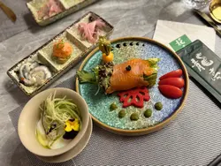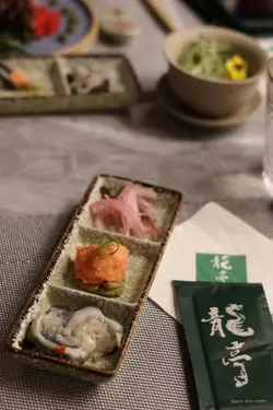,为今餐有个愉快的开端。餐牌写的是「前菜两款(渍物)」,到来的是共三款:三色洋葱渍、三文鱼他他及醋渍三文鱼鱼鲛伴昆布,三样东西都很好吃,由于是渍物,吃来更是酸香开胃