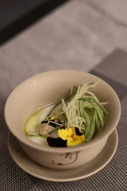 。接着来是「鱼子酱兰王温泉蛋」,兰王蛋向来名气甚大,尤其其鲜橙红色的蛋黄,蛋味极浓,做成温泉蛋,又添了些鱼子酱,绵滑细腻,浓郁丰盈
