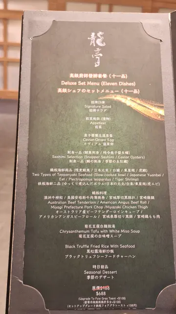 。虽在旧式商厦内,但一踏入餐厅,环境截然不同,一派和风装潢,优雅舒适。其中的10个堂前席是抢手位,虽然我们只是坐在其人四人桌子,一样不时看到师傅做菜时的火光熊熊。菜式选择十分之多,散点方面有沙律、前菜、肉类铁板烧、海鲜铁板烧、铁板烧料理、铁板炒饭及甜品,还有多款套餐供应,当然以套餐算起来最划算,而且,午市的话,七道菜 / 九道菜午餐才卖三、四百,实在相宜。而我们今次所品尝的是「高级厨师发办套餐(十一品)」,定价$688,菜式丰富