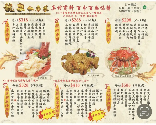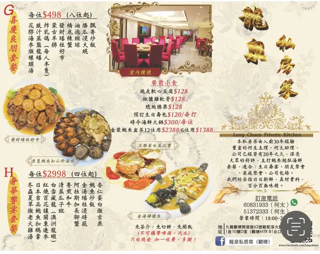 今年公司开年饭局选择中菜,相聚龙泉私房菜,按人头收费,份量好足兼太份,海鲜新鲜,捧肚而归,气氛非常热闹,全场好多客.重点菜色,芝麻鸡皮脆肉滑,鸡味香浓,特色之一,元贝新鲜好太只,芋蓉多士香味可口,虾非常惹味,原只鲍鱼扣山珍海味份量好足,味道好浓,花雕蛋白蒸蟹加钱提升了长脚蟹,非常鲜味,清蒸海斑好大条,火喉把握得刚刚好,肉质鲜滑,整体效果非常出色,每人只须$ 348可以食到如此丰盛的菜,下次相聚一定再来帮衬,记得提早预约…查看更多