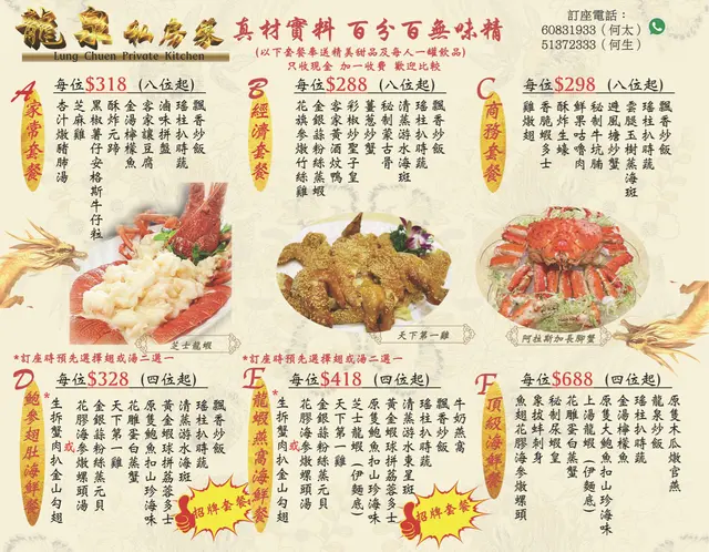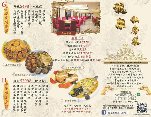 一早订咗房,拣咗个$708豪华海鲜餐,早一日confirm人数,回覆快。食饭当晚去到,环境就一般,一定唔系啲大商场𠮶种装修,但啲钱就系用咗喺食物度。去到上菜: 象拔蚌刺身,一兜花胶翅,龙虾伊面,椒盐濑尿虾,一盘鲍鱼花胶海参冬菇,一条柠檬汁煮鱼,蛋白蒸奄仔蟹,瑶柱汁时蔬,炒饭,同甜品木瓜鲜奶炖燕窝(唔记得有无打漏)。唔续样菜写了,因为每一样都煮得好有水准,系个炒饭可以干身少少啫。量方面亦好足,几本上食到奄仔蟹𠮶时已经有啲饱,最后仲要打包少少。可以咁讲,去招呼亲友同事,有啲乜嘢升职,聚旧,咁嘅菜色一定唔失礼。佢喺观塘工业区租个舖位而唔系喺啲大商场,悭咗啲钱就系喺食物度。值得推荐!…查看更多