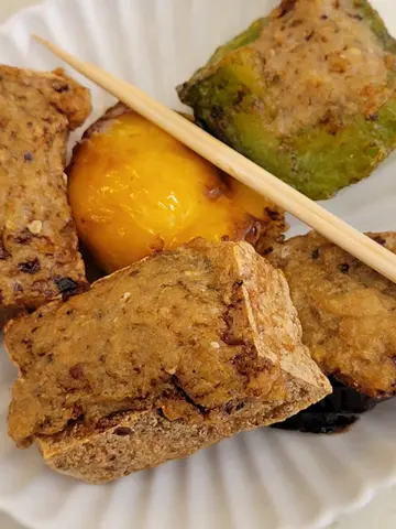 龙津煎酿三宝食评:材料很丰富,果然是镇店必点之选,每次去我都会吃这个,因为便宜,饱肚,又抵食,很好吃。看到如图,馅料酿得满满的,一看便知足料,果然是良心店家,亦很用心经营。豆腐炸得很香,边皮是脆的,做到理想的外脆内嫩,一点也没过火,十分专业,豆腐的调味亦相当恰当,不会过咸过淡,又有爽脆的灯笼椒,多重口感享受,不沾酱料都已经很好吃,我喜欢重味,所以建议沾辣甜酱和辣酱,或者椒盐也是个不错的选择。趁热吃是人间美味。…查看更多