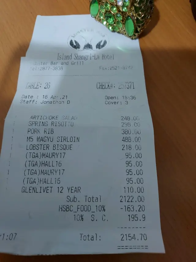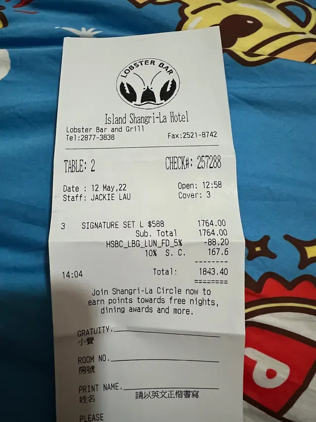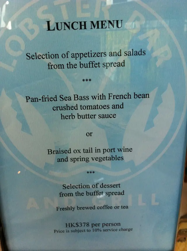 龍蝦吧餐廳 (金钟) 网上订位即赚Rice Dollars 网址: https://s.openrice.com/QrLS0M0S000 地址: 香港金鐘金鐘道88號太古廣場港島香格里拉6樓 电话: +852 28208560