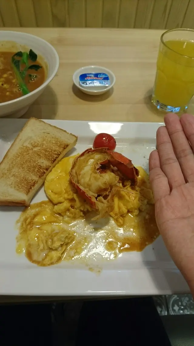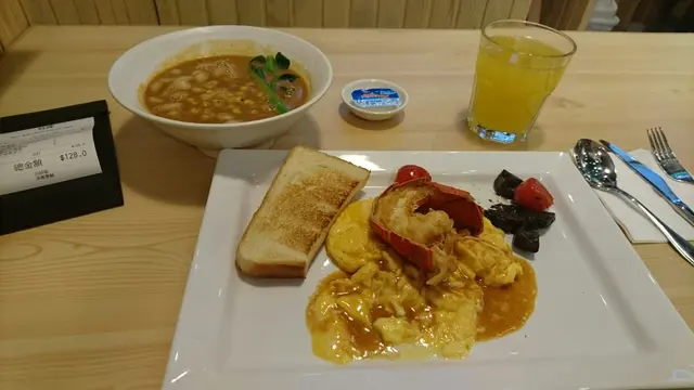 放工經過中環街市附近,又想食個輕食,見下午茶餐去到6:30pm仲有時間,就入去坐低左,目測店內除我之外得一檯客。木造裝修同檯椅令整體環境很明亮,卡位細細地都好舒適。店內播放著pop music,唔知人多會唔會覺得吵呢?原來下午茶都唔平,本住試新野心態就叫左個C餐:通粉配龍蝦湯,蔥花叉燒炒日本滑蛋,牛油多士,咖啡或茶。湯底好香龍蝦味,通粉都煮得夠淋,叉燒滑蛋好滑,牛油多士略嫌太細份了。檸茶正正常常。埋單$48唔駛加一。…查看更多