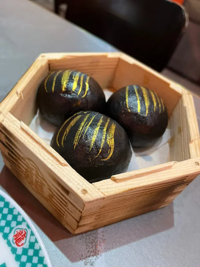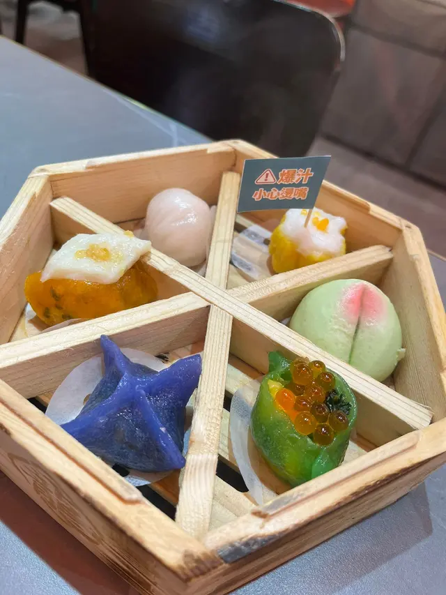 我们分别叫了叉烧肠粉,黑金流沙包,以及一盘精致又设计新颖的点心。
