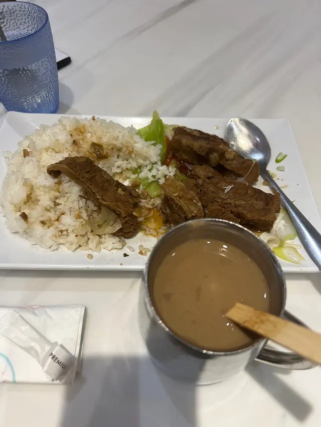 午市套餐:P7 鹽酥雞肉燥飯($52)凍珍珠奶茶(+$5)鹽酥雞份量少得可憐,得5粒,其中有2粒仲要好細粒,味道還算是可以,但唔太酥脆,明顯是已經炸好一段時間。肉燥份量適中,勉強夠撈哂啲飯嚟食,味道可以,唔太鹹,肥肉唔多。滷水蛋有半隻,味道正常。另外有些少雪茶及椰菜伴碟。凍珍珠奶茶,大杯,珍珠份量適中,但有啲珍珠中間仲硬硬哋,疑似未煮淋。奶茶味道一般,茶味偏淡,要咗少甜,都仍偏甜。$57有飯有凍飲,以青衣城嚟講算係咁,但食品質素就極之一般般。平日中午12點鬆啲,食客唔多,所以坐得都舒服。…查看更多