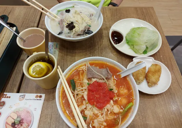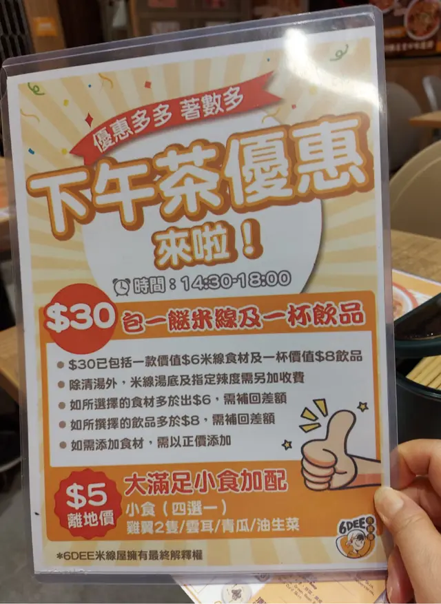 見網上有人話6DEE係譚仔譚家六弟開慕名黎試下行到黎發現原來開正譚仔隔離 御一品對面過幾個鋪位又有間賣薯粉長沙灣青山道真係香港米線街黎因為新裝修 舖面非常光猛裝修同一般米線舖風格唔同比較乾淨同colorful 又設計左專屬公仔😂座位闊落 坐得幾舒服舖頭用QR code自助落單湯底選擇比較多 有胡椒豬肚 新疆 水煮 麻辣 酸辣 清酸辣 蕃茄 清湯 配料就大部分無乜太特別比較特別既係日本溏心蛋同有款叫6DEE腩肉既揀咁我第一次食就叫左呢兩款餸再加豆卜湯底就叫左酸辣中辣一上菜就覺得賣相好吸引好紅 d配料排到好滿 個湯煮到起晒沙不過食落就無睇落咁吸引可能係差梗d香味 味道差d層次但真係好有小店煮米線會有既鍋氣食得出係逐碗用心煮果種overall唔差既 但無去到好驚豔米線都彈牙既 浸左陣都無覺得太腍配料份量真係好多所謂6DEE腩肉其實滷水腩肉 都幾好食溏心蛋就不過不失 無乜評論另外仲叫左碟辣DEE雞軟骨面灑左好多孜然粉聞落好香 但食落無乜味飲品揀左熱菜蜜覺得譚仔果D菜味濃D香D呢度有d死甜既感覺整體黎講我覺得係值得再試不過下次想試下其他湯底 例如新疆同胡椒豬肚…查看更多