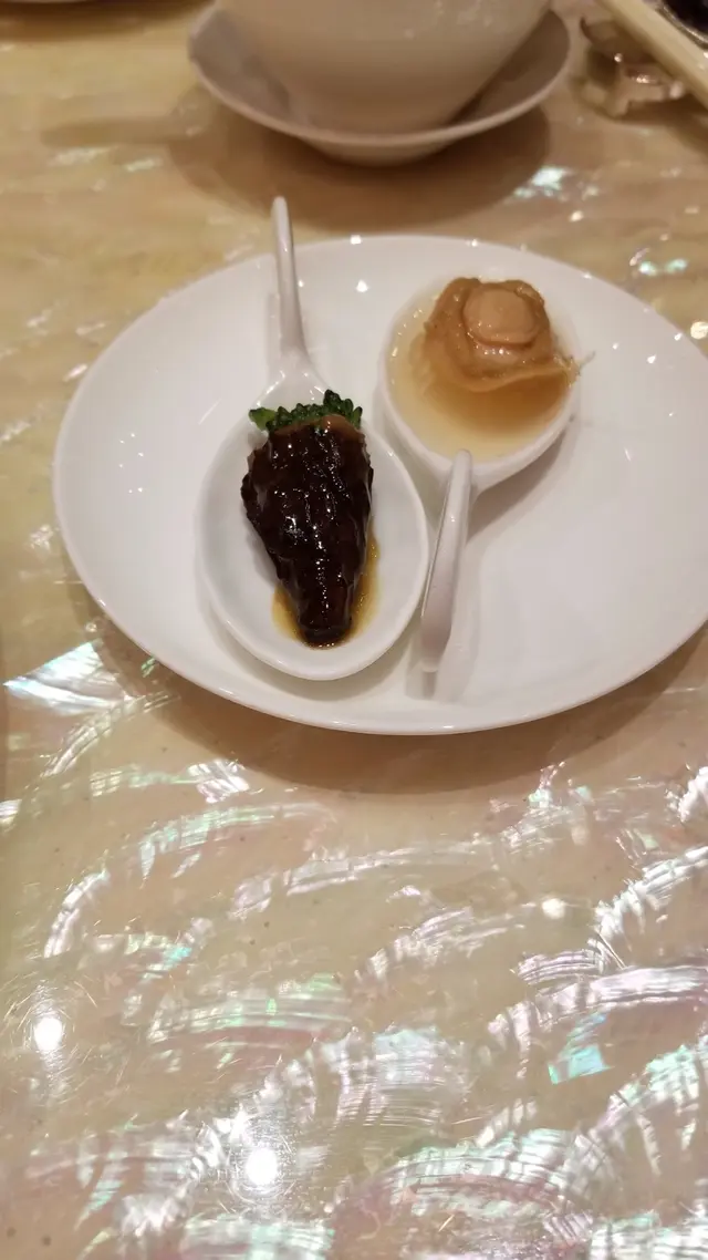 阔别澳门十多年后重游,不知何时会再来,临走朋友希望吃鱼翅,大家当然举脚赞成。以前曾在此食府用膳,那时亦以金鱼作装饰主题,多年后重临,主题依旧,但整体装修更添华丽。点了几款点心和鲍翅,忽然待应便奉上每人一碟内有小鲍鱼和梅子啫喱的开胃菜,虽然开胃菜并不特别美味,但还是让我们有意料之外的惊喜。胖嘟嘟的金鱼饺造型非常可爱,饺皮晶莹明亮,蓝天使虾爽弹虾味浓,令金鱼饺的色、香、味更立体。黄鱼饺的造型滑稽,饺皮有韧性但有点厚,鱼肉馅料嫩滑,然而鲜味比较淡,百合米汤的质感很是浓稠,带淡淡的粉香,整体平均,但试一次便可。牛肉球的卖相颇为有趣,穿上竹笙外衣的牛肉球就像一个球形的小蜂窝,窝孔吸满了酱汁,为牛球保持湿润,不须喼汁的加持也很美味。肠粉的粉皮十分剔透,清晰可见内里满满的馅料,黑豚叉烧香甜嫩滑,姜芽起了点睛的作用,增香解腻。💢红烧大鲍翅鱼翅如一把扇般浸在琥珀色浓稠的高汤芡汁中,翅针根根分明,有别于仿翅的口感,鱼翅入口软滑,一梳一梳的小翅扒挂满高汤芡汁,汤汁味浓醇厚,搭配的银芽也饱满闪亮,让人很是满足。葡挞和奶茶也是意外的餐后甜点,葡挞有点过甜而且蛋香不足,奶茶倒是幼滑,如同开胃菜一样,这料想不到的甜点,成为这顿餐食的完美结局。埋单时,侍应送上每人一块曲奇作为小礼物,心思可见一斑。…查看更多