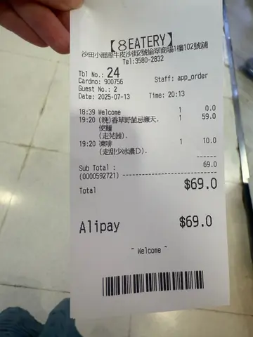 8 Eatery (沙田) 网址: https://s.openrice.com/QrLS0u7iC00 地址: 香港沙田小瀝源牛皮沙街2號愉翠商場1樓102號舖 电话: +852 35802832