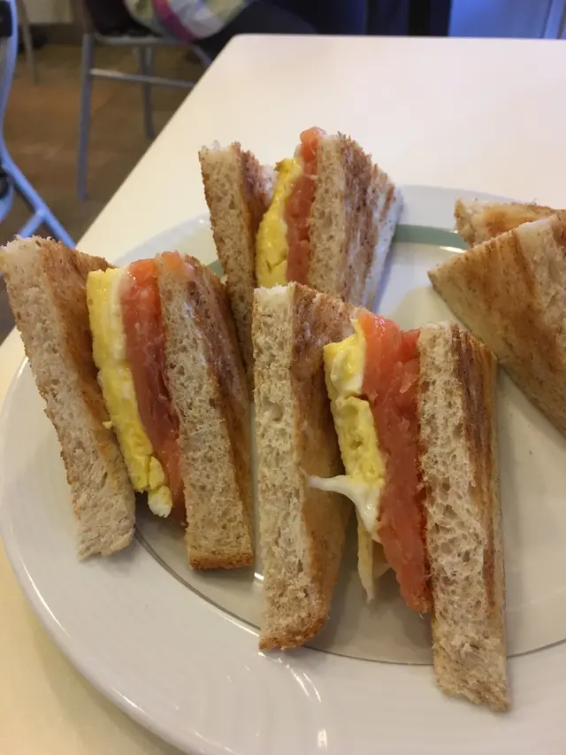 餐廳面積細小, 最多可容納约十六人, 所以時常都有人龍在門外排隊。早餐選擇不少, 對於有選擇困難症的我, 都幾頭痛。 飲品選擇亦比一般餐廳多, 而且款式比較特別,例如羅漢果茶、伯爵茶和白菊花茶等。最後選了煙挪威三文魚蛋沙律三文治配白菊花茶,43元。我選了麥包兼要烘底。個樣好掂,份量不少。煙三文魚好厚身, 雞蛋沙律都好多。煙三文魚色澤好靚,食落口好滑,好香煙三文魚味,三文魚味完全蓋過蛋沙律味,正。雞蛋和蛋黃比例不錯,沙律味不重,所以才提升煙三文魚味道。麵包旁邊之沙律似雜果沙律, 有薯仔、雜果、粟米及少量烚蛋白,其沙律味比較濃, 襯托薯仔一流。白菊花茶除有幾朶白菊花外,仲有茶包,老闆好濶佬呀查看更多