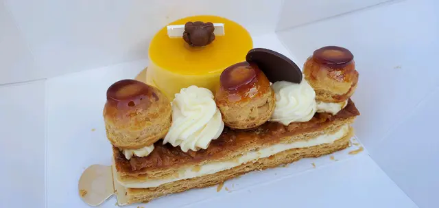 第一次嚟將軍澳野餐,買咗b仔cake ,我揀咗法式焦糖拿破崙泡芙HKD48,由於疫情將餐廳入囗縮到好細,入餐廳同take away 俾錢都迫埋一齊,所以買野嘅過程感覺好迫好擠湧。😑好好嘅天氣配上好好賣相嘅甜品心情係一百分😍🌳,黑色嘅外賣盒貫切b仔嘅簡單風格,由於有用膠紙將cake 定位,所以打開個look都仲好靚,無走樣。咬落去焦糖味好香,不過拿破崙已經唔脆🙄。查看更多