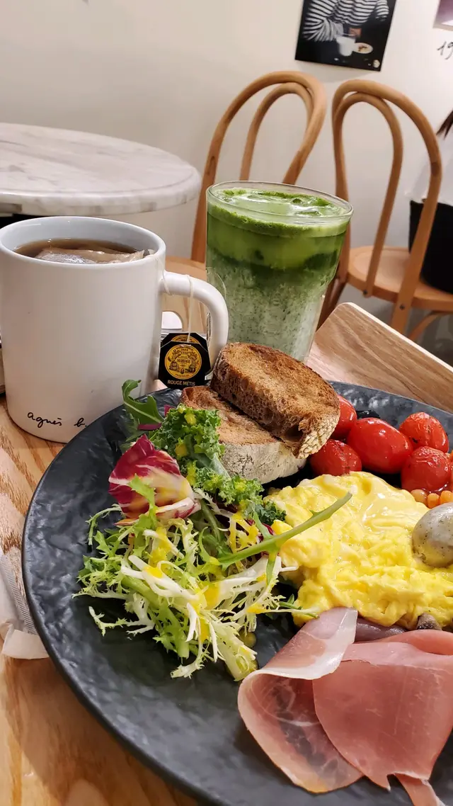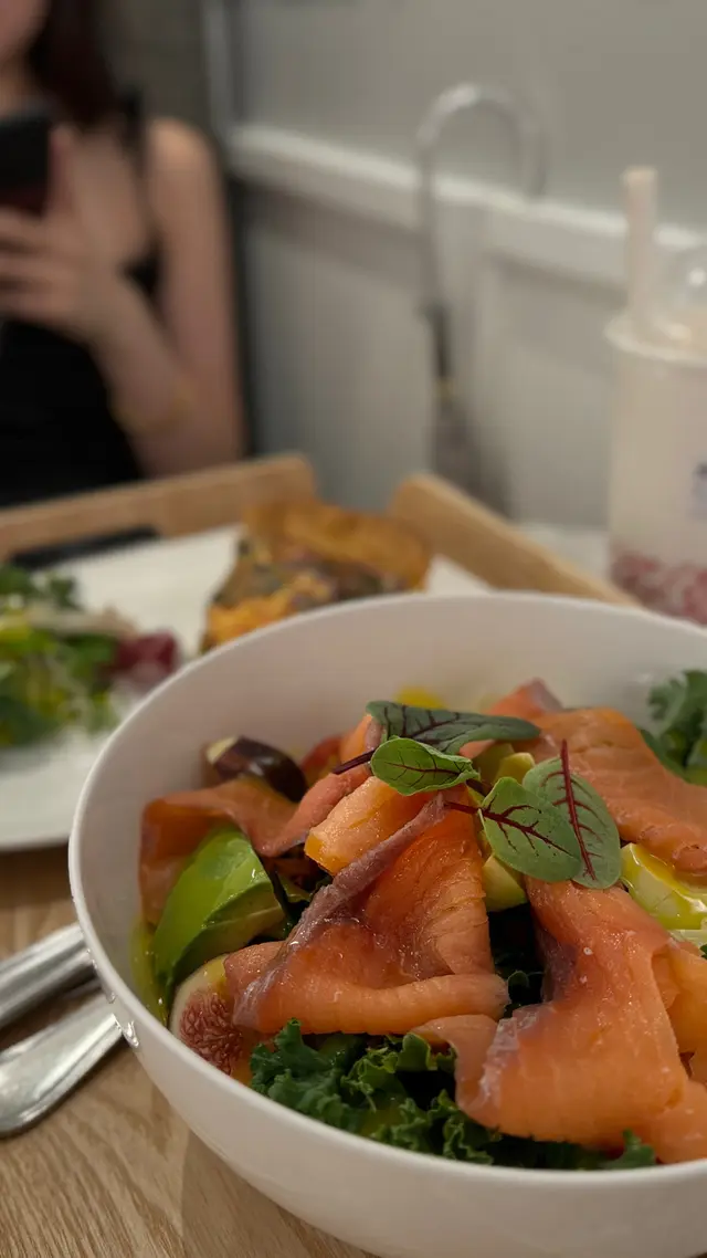 喺agnes b. café輕鬆悠閒嘅下午,點咗兩款招牌健康美味嘅菜式:Spinach & Sautéd Veg Quiche同埋Smoked Salmon Avocado Figs & Kale Salad!🥗🥧菠菜炒菜雜菜批外皮鬆化,內餡充滿香濃芝士同埋鮮甜嘅菠菜同炒菜,每一啖都係滋味滿分,仲帶少少溫暖嘅法式風情,非常啱做輕食或者下午茶嘅選擇。而煙三文魚牛油果無花果羽衣甘藍沙律就更係健康之選,煙三文魚鹹香濃郁,配埋creamy嘅牛油果、甜美嘅無花果同埋清新嘅羽衣甘藍,口感豐富得嚟又唔會覺得膩滯,簡直係一碗健康又飽肚嘅沙律!整體嚟講,agnes b. café係一個結合法式風味同健康選擇嘅完美去處,食物質素穩定之餘仲超級適合打卡,推介俾所有鐘意健康輕食嘅朋友~…查看更多