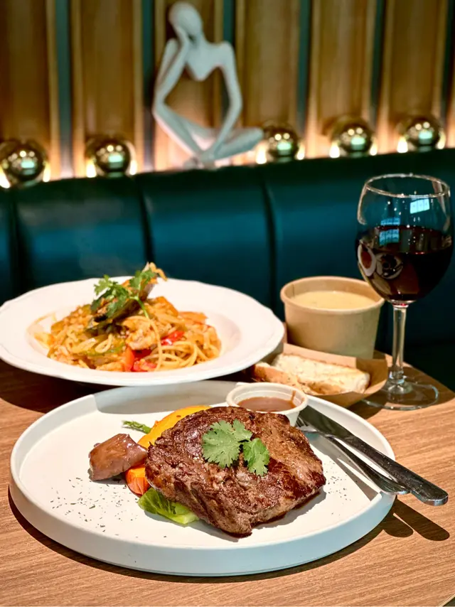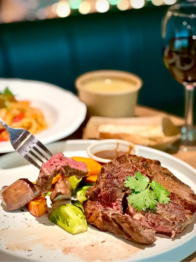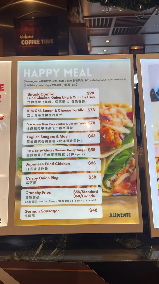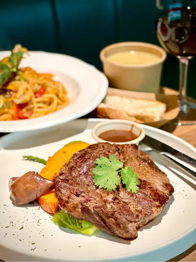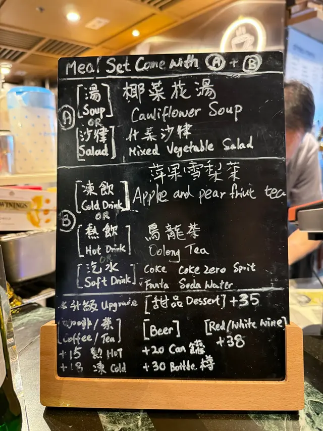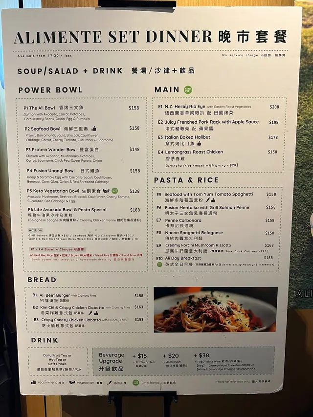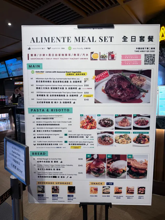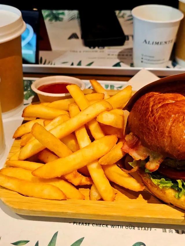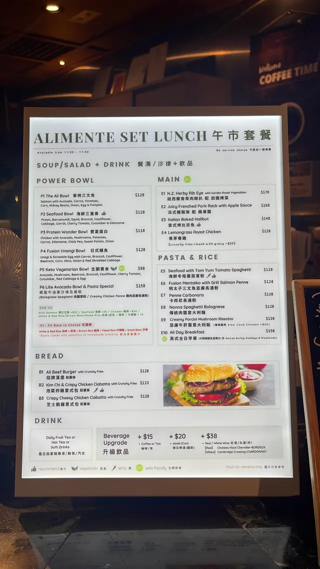 Alimente喺圓方戲院位置,已經開業幾年,可能因為地點較隱蔽,人流通常一般。但近幾個月可能因為圓方轉換咗好多食肆尤其記得shake shack 以前lunch time都好多人,而家冇咗令D返公人仕發現到Alicante嘅存在而家lunch time時間12:15過後都要等位,出餐時間亦較耐。有好有壞,起碼即叫即整 但趕返公司就未必啱啦今次同朋友一人叫一個餐, 個set已經包埋前菜沙律或湯及一杯熱茶或凍水果茶,冇加一 。1. 意式香煎肉眼扒配自家製紅洒醬 $218我柯打5成熟牛扒但上枱見過熟,應該變成7 成熟。所謂香煎但唔夠焦香。個紅酒醬唔特別好味。配菜用上新鮮椰菜花、西蘭花、蕃茄仔、婑瓜、南瓜,以set價錢嚟講算唔錯,起碼件扒有肉汁同埋都算淋個椰菜花湯做得唔錯,好香椰菜花味及調味不錯果茶今日係蘋果雪梨茶,味道較淡2. 招牌牛肉漢堡配薯條 $138漢堡好豐富,除咗beef patty還有煙肉及大量沙律菜及蕃茄。但亦都係覺得個patty唔夠蕉香。個人非常喜歡食薯條,呢度可以做到外邊非常香脆入面軟淋,好正👍…查看更多