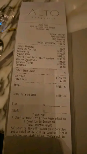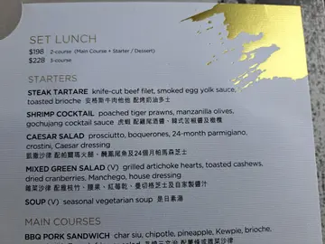 庆祝朋友生日,选了这间一直想去光顾的餐厅。之前因Discovery HK推广送coupon,而认识这间位于铜锣湾时代广场隔一条街,没那么繁忙的商业大厦楼上的餐厅。餐厅颇有规模,座位宽敞并有落地大窗望海景,环境很舒适。 中午时段餐厅提供set lunch,有多款starter、main course及甜品选择(3-course $198 / 3-course$228,其中几款主菜有额外收费)。我与朋友选了2款starter,steak tartare及shrimp cocktail, 及2款主菜,Caprese pasta及roasted sea bass(鱼需额外加$78)。无论starter及主菜都色香味俱全,头盘安格斯牛肉他他的牛肉及虎虾配鸡尾酒酱的虎虾都新鲜,主菜意粉应是手工幼面,咬落韧度适中。去过2次意大利深度游,当地吃到的意大利粉非一般香港的意粉可比,而Alto这个意大利粉是正宗口味。主菜意大利粉份量足,配上足量的sun dried tomatoes及水牛芝士,十分滋味。另一个主菜烤鲈鱼配粟米、蚕豆及奶油酱,份量亦足,鲈鱼又嫩滑,酱汁特别又浓郁。我个人觉得2个主菜都是必食之选,餐厅定价中上不算很平宜,但相比食物份量亦足,不似有些餐厅连主菜都份量不足,有机会吃不饱。以这餐厅食物质素及定价,我会推荐给朋友亦会再来光顾。 特别一提,我在openrice订枱,亦写上是此次用餐是为庆生,没料到餐厅会窝心地送上一碟甜品及用朱古力写上生日祝福语,实在难得。餐厅服务很好,唯一要提提大家,即使不叫饮品只要清水,餐厅会照餐牌上一项free flow water收取$30,个人感觉如果要收费,起码供应矿泉水而非一般清水。