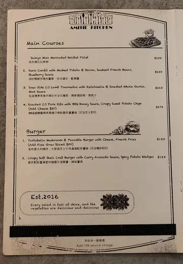 Amitie Kitchen装潢以柔和灯光配搭木系家俱,营造出温馨而优雅的用餐氛围,特别适合情侣或朋友共度悠闲晚餐。晚市选择丰富,包括餐前面包、前菜、主菜、饮品及甜品。 餐前面包令人惊喜,有牛角包、竹炭面包及竹炭脆面包捧,外脆内软,香气扑鼻,为整顿晚餐揭开序幕。前菜是火炙半熟三文鱼伴紫苏莎莎,三文鱼肉鲜嫩,微炙的香气与紫苏的清新完美融合,仲有新鲜既沙律菜。主菜方面,牛肝菌芦笋意大利饭口感creamy,菌香浓郁;而8安士美国顶级西冷则肉质鲜嫩多汁,我哋叫左7成熟,觉得火候掌握得恰到好处。配搭冻抹茶牛奶朱古力饮品,茶香与朱古力味道层次分明,甜度适中。甜品是士多啤梨朱古力窝夫伴士多啤梨雪糕,窝夫外脆内软,配上香滑雪糕与新鲜士多啤梨,为整顿晚餐划上完美句号。整体而言,食物质素非常高,环境气氛都令我们很满意,是值得回访的浪漫餐厅。…Read More