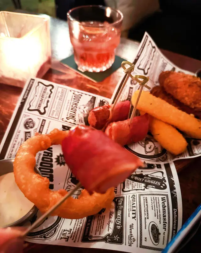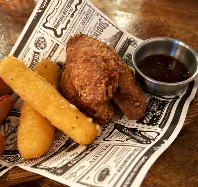 小食拼盤 送到了, 這個拼盤: 洋蔥圈, 芝士條, 煙肉腸, 及雞翼,