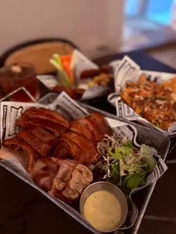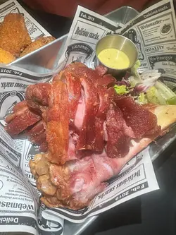 【型格酒吧。咔咔脆猪手】位于深水埗的工业风酒吧外表有种冷调、但巧妙融入一些绿植,让空间显得更加平衡和放松。地点在不是在深水埗中心点,但也容易找到,非常适合朋友聚会与小酌聊天。❈ 德国咸猪手HK$258洛神花蜜桃酒 x2 (免费送)猪手外皮烤得酥脆,咬下去有清脆的口感,猪手肉质饱满有胶质,整体弹牙,带有烟熏香气。不会过于油腻。一份量十足,非常适合与朋友分享。最划算就是点猪手会送2杯洛神花蜜桃酒,第一次喝到这个口味的酒,清爽易入口,跟香口食物很搭。❈ 芝士肉酱玉米饼 (鸡)HK$118(L)玉米饼上铺满热腾腾的芝士与鸡肉灯,芝士味道浓郁而且搭配了蕃茄和辣椒,口味清爽,咸香度适中。配合酥脆的玉米片吃起来丰富且有层次,适合当作下酒菜。❈小食拼盘 HK168拼盘包括洋葱圈、芝士条、烟肉肠和鸡翼等多款小食,份量均衡且适合多人分享。洋葱圈炸得恰到好处,外酥内香,芝士条浓郁但不腻,烟肉肠和鸡翼口感丰富,咸香开胃,整体多样化且味道不错。注:逢星期日至四 4 - 8PM,Follow IG 即享指定食品 50% OFF…查看更多