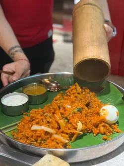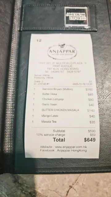 见到一间好得意嘅印度菜。原来系屺立60年正宗南印度过江龙。有好多分店。今次专程来打卡一条很长很长的Butter Dosa。试试印度香料的口感。牛油薄煎饼 Butter Dosa抹上香浓牛油外皮酥脆的薄煎饼。好长好长打卡之选 。好重牛油香味, 煎饼极之香脆,食到停唔到口。净食已经好好味。仲有四种唔同酱料 各有风味:椰子,薄荷,蕃茄酱与香辣豆酱。鸡肉棒棒糖Chicken Lollypop外酥内嫩的鸡腿棒棒糖,红辣椒酱不太辣与香料很配合。外皮香脆,肉质嫩滑,再配印度特制甜酸酱汁,非常惹味。Bamboo Biriyani Mutton羊肉竹筒印度饭米饭吸收了羊肉的鲜香与香料的精华,竹筒的蒸煮方式让香气更集中,羊肉肉质更软嫩入味。上菜时服务员会在你面前将竹筒饭倒出嚟。香气飘出来。黄油鸡咖喱 Butter Chicken Masala浓郁的咖哩带番茄,奶油酱汁。包裹著嫩滑鸡肉,是印度咖喱中的经典。入口香浓。搭配印度大蒜烤饼 Garlic Naan烤得微焦的大蒜烤饼香气扑鼻,内层柔软,沾咖喱吃更是绝配。芒果印度奶昔 Mango Lassi芒果的果香与乳酪的酸甜完美融合。好重芒果味,解辣一流。马萨拉茶 Masala Tea充满香料的奶茶散发著肉桂、豆蔻与姜的气息,茶香浓厚,奶味柔滑,味道非常特别。…查看更多