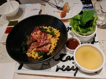 午市套餐头盘:凯撒沙律作为午餐嘅开场,呢碟凯撒沙律算系清新嘅选择。生菜新鲜,咬落几爽脆,但凯撒酱稍为欠层次感,可能会觉得平平无奇。面包粒同烟似碎系灵魂所在,尤其系𠮶几粒烟肉,咸香味成功将沙律救返少少。主菜:泰底猪肉炒河成碟炒河香气十足,仲带少少镬气,猪肉片嫩滑,啲汁同河粉都吸得啱啱好,唔会太油腻。加埋辣椒粉𠮶阵微辣香气,配青柠嘅酸香,真系泰式风味爆棚!泰式奶茶平时出边饮一杯都成$30,而家跟餐包埋都几抵味道: 😋😋😋😋😋😋环境: 🤩🤩🤩🤩🤩🤩🤩服务:🫡🫡🫡🫡🫡🫡性价比: 🤑🤑🤑🤑🤑🤑