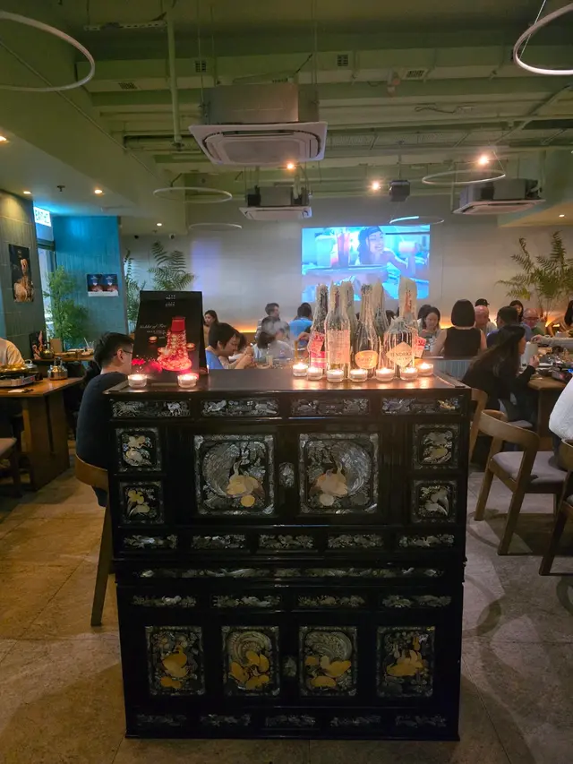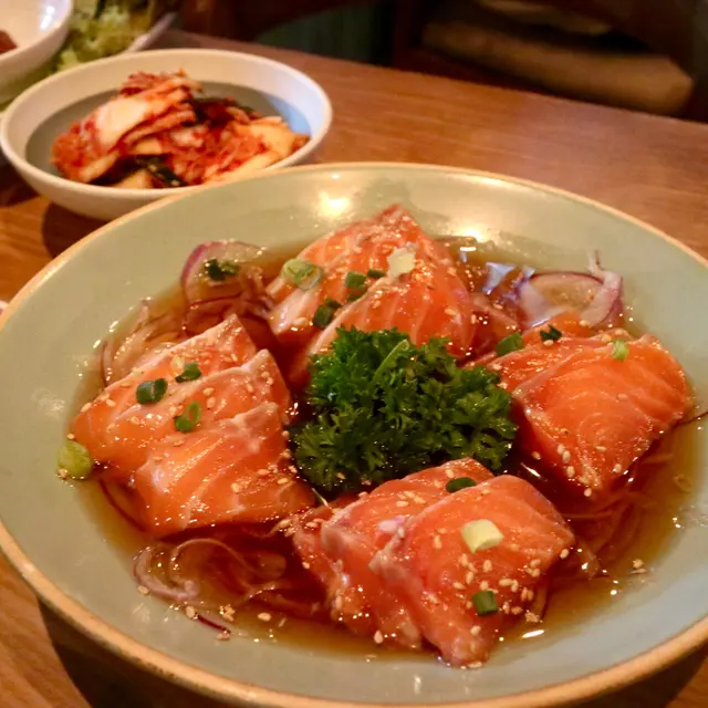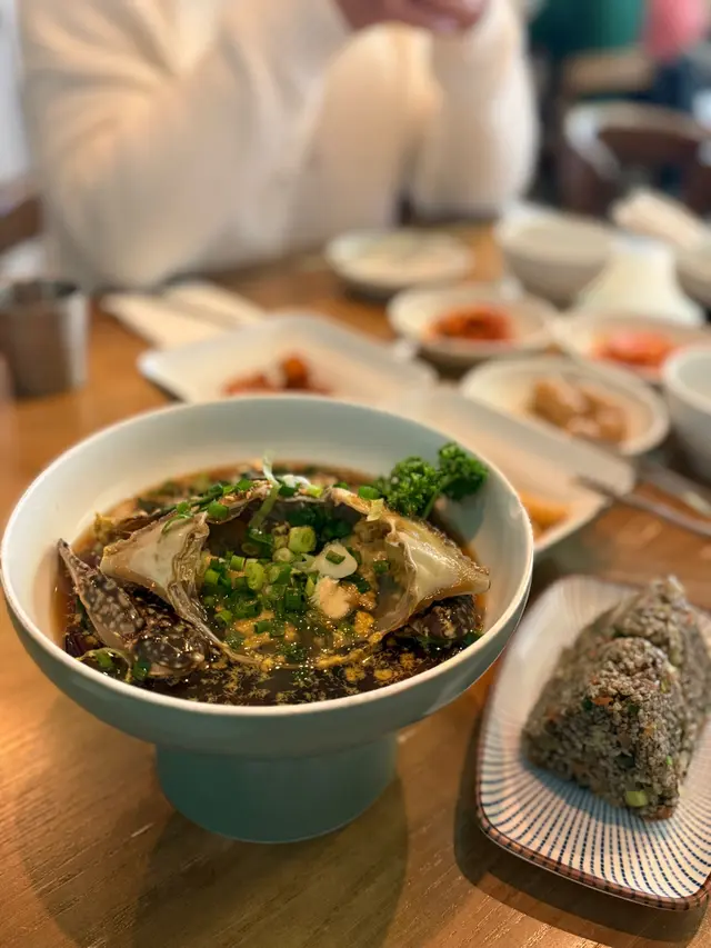 餐廳好多新派韓式嘢食嘅選擇, menu幾有新鮮感。醬油蟹:醬油甜味較重,蟹嘅份量幾大,蟹膏頗多。整體係好味同埋食得滿足。另外佢送上一個紅米飯團,介紹話可以唧啲蟹肉撈埋啲飯一齊食。但係個飯團本身都整得幾鹹幾重口味,撈埋啲蟹肉落去食,唔覺得增加多咗鮮甜味,好似兩樣唔關事嘅嘢夾埋一齊,冇增加成個chemistry。🤔排骨火鍋:佢係泡菜湯底,入邊有好多排骨。排骨幾大嚿,肉唔多,味道淡淡地,有啲似煲咗湯嘅排骨再撈埋炸菜 & 泡菜嘅湯底。個人覺得冇咩特別,唔使特別嗌。💯海鮮煎餅本來對呢類煎餅冇咩期望,食過好多次都係係粉粉嘅質感。點知食落又幾驚喜,佢冇咩粉,食到好多韭菜,再撈埋好薄好薄嘅蛋漿嘅口感。好味。上面有一隻雪藏蝦,質感爽彈,但係冇咩味。芝麻雞:睇openrice 呢度熱門菜式係黑芝麻雞,就點一個。佢係好濃厚甜甜嘅芝麻醬依附咗喺啲炸雞上面。對我嘅口味,覺得太甜唔鍾意。因為餐牌幾有新鮮感,有機會都可以再嚟試。さらに見る