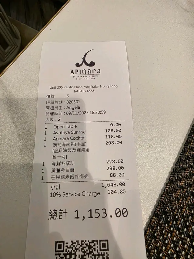 Apinara (金钟) 网上订位享低至8折优惠并赚Rice Dollars 网址: https://s.openrice.com/QrLS0diG700 地址: 香港金鐘金鐘道88號太古廣場L2樓205號舖 电话: +852 31071888