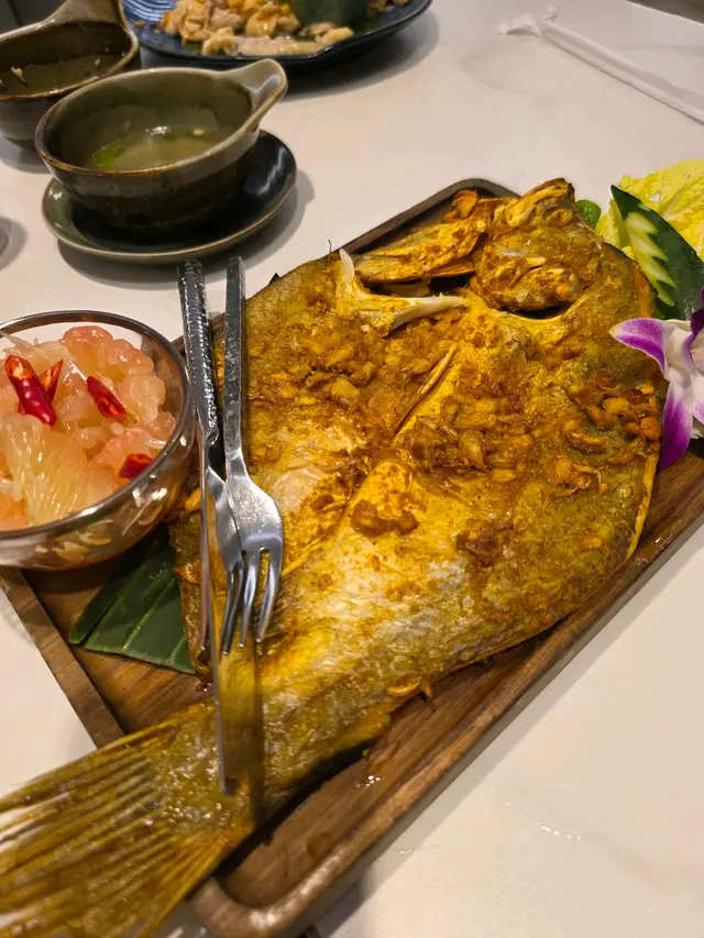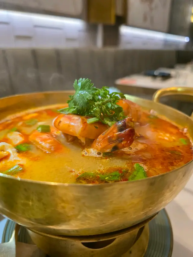 呢間餐廳位於金鐘太古廣場入面,環境高貴又舒適好坐,而且都好適合團體聚餐我地叫左一份海鮮冬蔭功湯:呢度既冬蔭功係原煲上既新鮮滾熱辣,而且份量都幾大煲,入面加入左好多唔同既海鮮有青口,原條大蝦切半,魷魚,帆立貝等等,味道酸甜開胃,飲落好暖胃。燒黃薑金目鱸:呢度秘制即燒原條鱸魚,用左咖喱醬汁燒到外皮香脆魚肉好嫩滑而且無乜骨好易食。呢度既冬蔭大蝦粉絲煲都好推介因為用左原隻大蝦由生煮到熟。海南雞(半隻) 配油雞飯及清雞湯一碗,海南雞配油雞飯大大碗,海南雞肉嫩滑份量都幾多,沾上泰國秘制醬汁食好夾。芒果糯米飯:糯米飯熱辣辣,配埋椰汁醬汁好清新。cocktail:ayuthya sunrise:柑橘利口酒,菠蘿汁,青檸汁,蝶豆花香,香茅,香茅味比較出眾,藍紫色好吸睛。apinara cocktail:whisky加pineapple juice,apple juice,lime juice,cinnamon 清新易入口口感。…查看更多