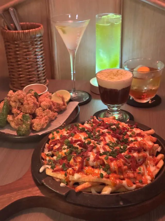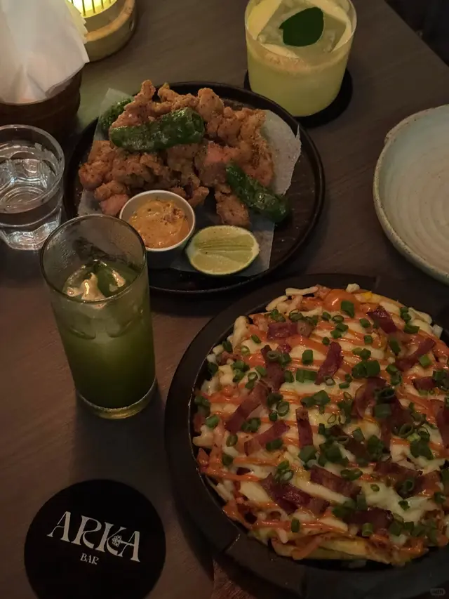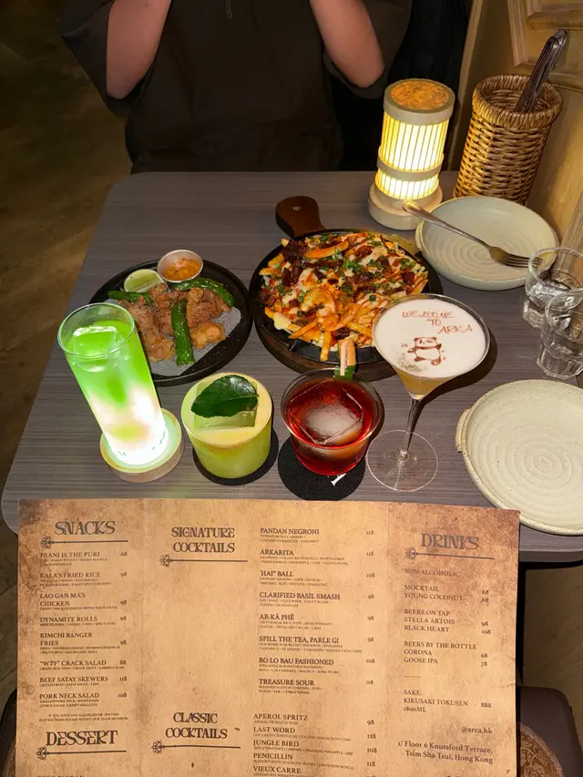 原來金巴利道後面藏著一條夜街⭐️好多不同風格的bar🍸下班小酌🈶因為下雨天,找了家樓上室內的【ARKA】誤打誤撞挖到bao了!這家的signature和classic好漂亮!出品也🉑【Cocktail】🍹ARKA PHE奶蓋9😍topping是開心果碎 有點椰香斑斕的感覺 底下是咖啡小甜9,好適合女孩子!!🍹High Ball 清9+氣泡水+抹茶🍵,這杯好有儀式感!而且口感清爽,帶點微酸,喝到底下是淡淡的抹茶感,這杯女生也會喜歡的❤️🍹Last Word這杯是金9基底,酸酸的也是清爽的感覺!高腳杯好有feel~🍹Vieux Carre威士忌🥃加橙子🍊的味道,好有氣質的感覺,這杯適合男生【Snacks】🥘kimchi banger Fries薯條上面鋪著滿滿的芝士泡菜辣醬 再撒上油香的培根碎,和雞尾9🍹好搭哦🍗Lao Gan Ma‘s Chicken名字一下看上哈哈哈,老乾媽這麼洋氣了,是辣味的炸雞,酥酥脆脆的,辣度在香港口味來說稍微偏高一點哦,點上搭配的醬味道up👍這家藏在樓上,環境和cocktail 🉑下次還來~…查看更多