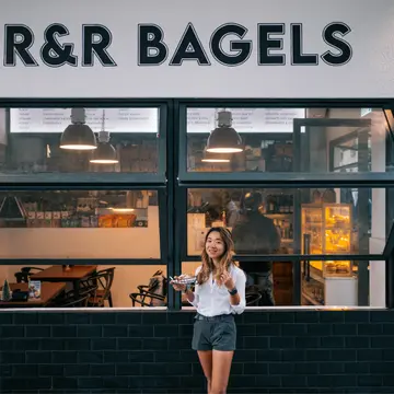 咖啡店在一级历史建筑艺穗会斜对面,店内有三分之一的空间改作服装店。店主应该是王家卫和梁朝伟的影迷,近落地玻璃门入口挂了三幅电影海报——《春光乍泄》、《花样年华》、《2046》。这天早上摄氏三十四度,我从山下的港铁站出口往山上走,到达时已经汗流浃背。因此,我点了一杯桂花咖啡通宁(Osmanthus Espresso Tonic)和一份蓝莓忌廉芝士贝果(Blueberry Cream Cheese Bagel)。咖啡通宁用双层玻璃杯盛载,可减慢冰块溶化的速度。咖啡饮落口冰凉清爽,还有淡淡的桂花甜味。贝果是白色的,外形比一般贝果瘦削。涂在表面的蓝莓酱好好食,那种不是化学剂的甜味,而忌廉芝士更是令贝果的层次更丰富。Osmanthus Espresso Tonic $55Blueberry Cream Cheese Bagel $58