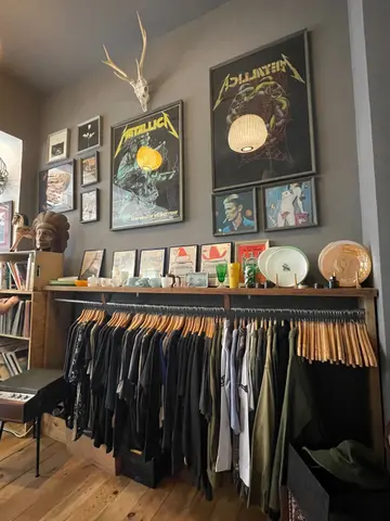 好多杯子。好多复古物品有黑胶唱碟和海报,