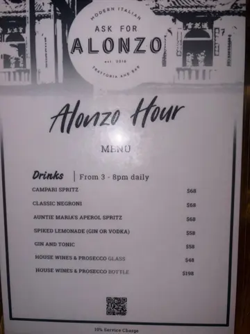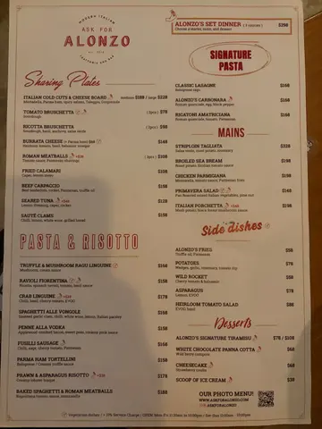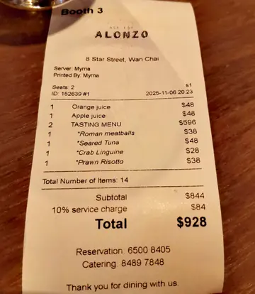 闺蜜约我去位于湾仔星街地下B号舖的 <Ask For Alonzo> 食晚餐,环境舒适,坐得舒服,气氛悠闲。我哋点左2个 Testing Menu $596:🍴Sharing Plates :🔅Roman Meatballs 罗马肉丸(3颗)配蕃茄酱及巴马臣芝士$38:罗马肉丸软绵入味,芝士拉丝。🔅Seared Tuna 香煎吞拿鱼,柠檬酱,水瓜榴,火箭菜 $48:吞拿鱼新鲜好味,配菜丰富,口感有层次。🍴Mains:🔅Crab Linguine 蟹肉意式扁面面,辣椒,萝勒叶,车厘茄及特级初榨橄榄油 $28:意式扁面软硬适中,有咬口又挂汁,面头铺有蟹肉及配料,好味又好食。🔅Prawn Risotto 大虾芦笋意大利炖饭龙虾忌廉汤酱 $38:五只大虾好味弹牙,意大利饭香软入味。🍴Desserts :🔅Alonzo's Signature Tiramisu 招牌提拉米苏:提拉米苏带有酒香又好味。🔅Cheesecake with strawberry sauce 芝士蛋糕配士多啤梨酱:芝士蛋糕香软好味。🍹Drinks :🔅 Orange juice $48:橙味香浓,好饮。🔅 Apple juice $48:苹果味浓,健康之选。…查看更多