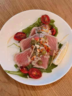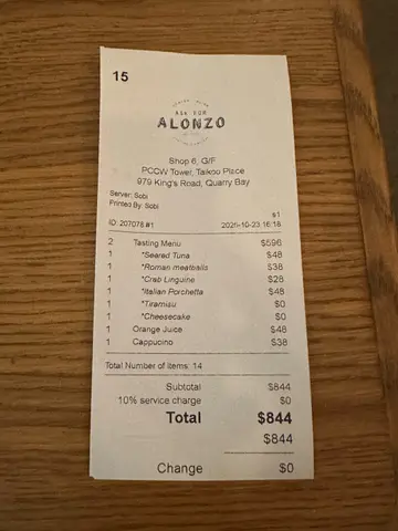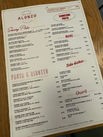 约咗同事去「Ask for Alonzo」食意大利菜🇮🇹餐厅环境舒适有格调✨.⚠️此餐厅收取10%服务费💰.Alonzo’s Set Dinner(2位)🍽️套餐$596💰.Italian Porchetta🐖跟餐$48💰意式烤猪腩肉非常厚身😱皮层烤至香脆😆但肉质略嫌偏咸同太嚡🥺底下有薯蓉同黑蘑菇汁🥔🍄🟫.Crab Linguine🍝跟餐$28💰蟹肉意式扁面🦀表面被初榨橄榄油包覆🫒加上辣椒🌶️ 车厘茄、罗勒叶🌿微辣口味😋.Seared Tuna🐟跟餐$48💰吞拿鱼煎至半生熟🔥加上洋葱🧅水瓜柳、彩椒🫑伴上车厘茄同火箭菜🥬再加上柠檬汁🍋清新开胃🤤.Roman Meatballs🧆跟餐$48💰罗马肉丸超大粒😍肉质松软😬表面加上巴马臣芝士🧀加上浓郁番茄酱🥫好味道😛.餐前面包🥯免费💰有日晒番茄干面包同果仁提子干🍅🍇烤得外脆内松软😗配上松露巴马臣芝士酱🖤.Alonzo’s Signature Tiramisu🧁套餐包含💰外层芝士香滑😉接近中间手指饼位置,食到阵阵咖啡酒酒香味🍾.Cheesecake🍰套餐包含💰软滑芝士蛋糕☺️配上酸甜士多啤梨酱🍓.Fresh Orange Juice🍊单点$48💰.Cappuccino☕️单点$38💰…查看更多