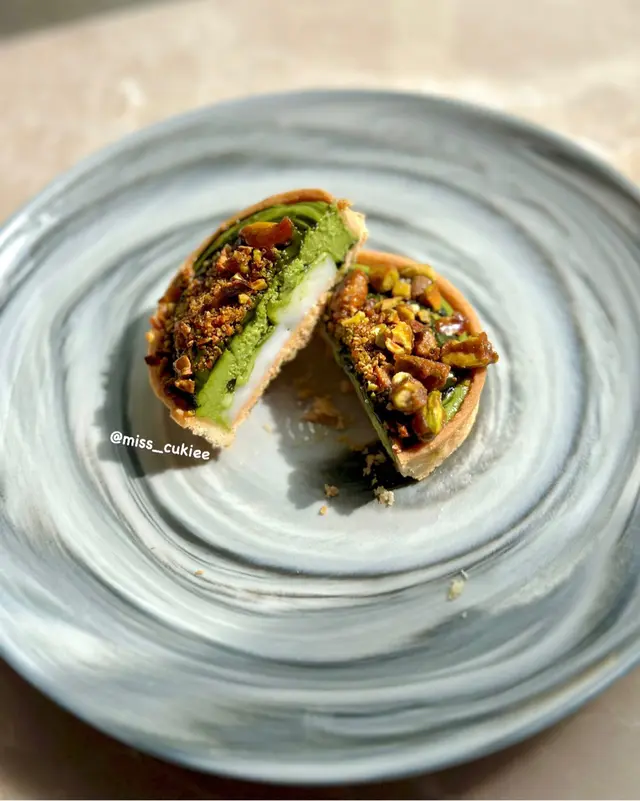 嗰日原本諗住帶朋友嚟買蛋糕,但蛋糕店不見,被我哋見到呢間個玻璃櫃放咗多款開心果糕點😍 輪到我買嘅時候,剩下一件原味撻皮的三重開心麻糬芝士撻,就買咗佢啦。*💚 三重開心麻糬芝士撻(原味撻皮)(HK$68). 上面灑上店主自家製嘅手炒焦糖開心果粒,好香好脆. 下面是用咗 3個產地嘅開心果 — 意大利西西里島、日本同美國,製成流質軟心口感嘅開心果餡. 之後會食到煙韌原味麻糬. 最後是薄脆的原味芝士曲奇撻皮. 食一啖就有多重口感味道,好豐富呀~Read More