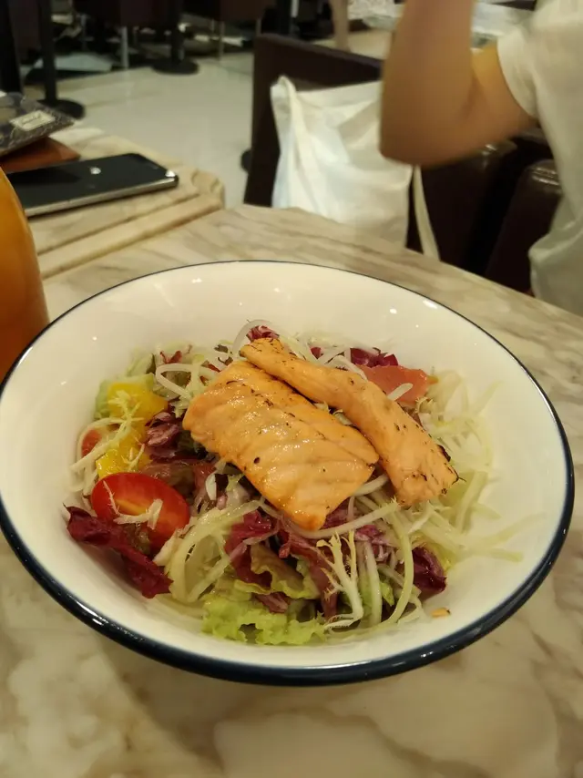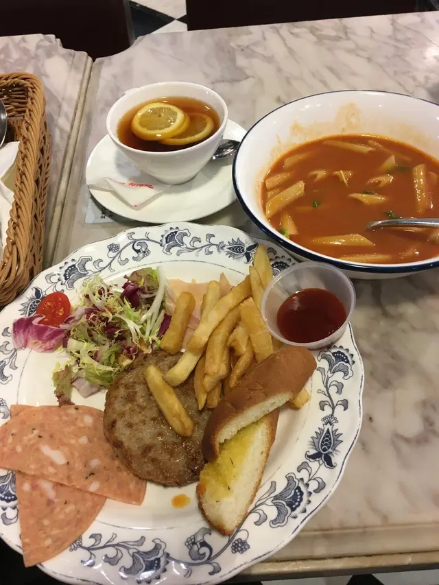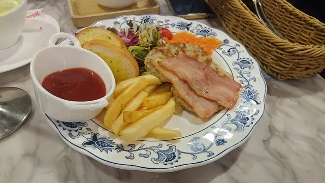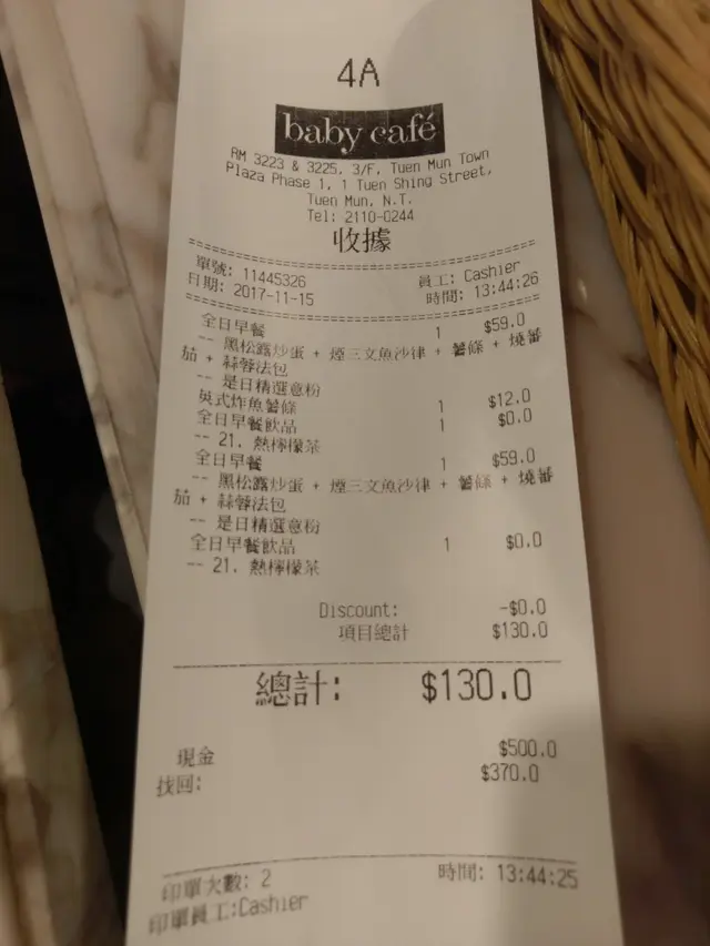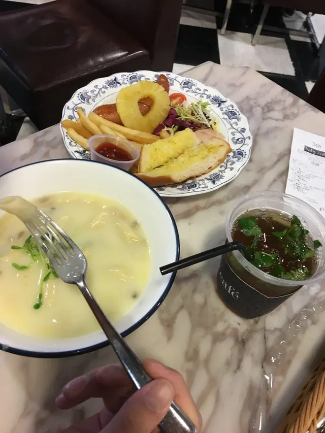 有日好夜要入屯門市廣場做嘢,入去首先醫咗肚先,見周圍好多鋪都關咗門,咁見到呢度仲未關門就去試下啦呢度係自己去點餐,點完餐有個牌比我,之後揾位坐,稍等一陣就有職員送上餐首先叫咗個全日早餐,早餐好豐富,重要嘅係價錢唔貴而食到貴價餐廳嘅質素,真係用平、靚、正嚟形容