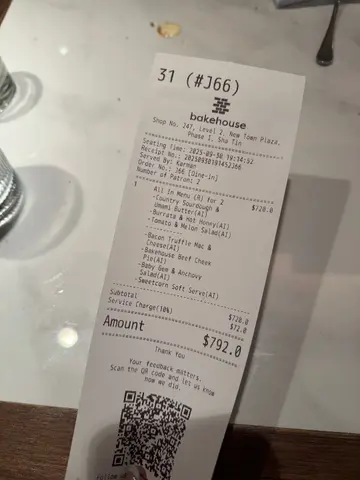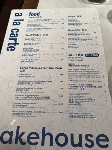 【沙田区】【bakehouse】难得约到中学同学食晚饭,几条佬又开始烦食乜。跟住有人提出呢间,咦,我都几好奇,原来呢间烘焙店竟然有做埋餐厅。门口整埋餐厅区域自助排队机方便排队,的确,睇返啲报道,之前都真系几多人排队。不过我哋去𠮶晚就好彩啲,排三张就到我哋喇。间嘢系食西餐嘅,系少少精致𠮶只,唔系一份质饱你𠮶啲,所以都要谂吓点配搭。不过呢度都有照顾呢啲选择困难症顾客嘅需要,直接以 $360 一位嘅价钱食「All In! 套餐」,厨师发办,面包、前菜、主菜、配菜、甜品乜都有啲,只系需要讲低唔食乜就可以。我哋就有遵守佢哋「全枱参与」嘅规则,要食一齐食。要两位或以上先可以叫呢个,我哋亦都够人。而佢哋个餐应该唔算好多肉食,所以可以每位加 $80 转一款主菜做「M4和牛西冷」,成件事就滋味啲。不过我哋比较想食佢原本嘅套餐,加上穷,就唔转喇。叫完呢个套餐之后,大家嘅心情都舒畅咗好多,因为唔使谂食乜。侍应妹妹都好用心讲解个餐有咩食,四位嘅话就会提供十四样食物,包括两款面包、四款前菜、四款主菜、两款配菜,同埋两个甜品。亦都可以另外叫嘢饮,不过我哋冇叫到嘢饮,净系饮水。面包方面,有各 $68 嘅「乡村酸种面包配蒜香海藻味噌牛油」同「意式鳀鱼茄子芝士面包」,我觉得个酸种面包吸引啲,𠮶款牛油亦都有种好特别嘅咸香。而后者就似啲蕃茄包咁,我唔太热衷呢个味,属于口味问题,本身佢落埋鳀鱼落去,都算系有诚意嘅。前菜有四款,各 $128 嘅「蜜糖白桃布袋芝士」同「松露生牛肉他他」就比较出色,前者为芝士加上甜味,好特别。后者就几浓香牛味,够晒邪恶。令到 $98 嘅「辣蕃茄酱猪牛肉丸」同 $88 嘅「蕃茄蜜瓜沙律」相形见绌,冇特别,加上个人唔好蕃茄味。主菜最出色系各 $248 嘅「黑松露烟肉芝士通心粉」同「Bakehouse 酥皮肉批」,前者嘅松露味唔会太抢,烟肉芝士味够香,后者个馅系牛脸颊肉,都有牛味出到嘅。而 $268 嘅「脆炸酿芝士猪扒」系厚粉薄切猪扒,都几油几肥腻,有啲似喺南美食到𠮶啲。主菜仲有 $268 嘅「招牌辣酱烤春鸡」,都几细份,但系个辣酱系惹味嘅。配菜就有各 $48 嘅「蒜香脆炸薯条」同「鳀鱼酱宝石生菜沙律」,前者炸得几好,热辣辣,外脆内软,有个好似 mayonnaise 咁嘅酱点吓,肥仔咗。后者嘅生菜几够味,个咸香系正嘅。最后系甜品,有 $88 嘅「酸种酥皮苹果挞配冧酒意式雪糕」同埋 $58 嘅「甜粟米软雪糕」,前者个苹果味唔系太浓,但够甜够邪恶。后者系夏日限定产品,粟米味雪糕配牛油粟米粒喺层次上已经够特别,加埋海盐焦糖同埋粟米片,有少少食爆谷咁嘅感觉。我自己计佢哋本身加埋系 $1852,不过由于系餐厅发办套餐,最后加埋一埋单先 $1584,每人 $396,都真系食到我哋饱嘅。而呢个加一都系值得收嘅,每位侍应上菜都有稍为讲解𠮶道菜,负责我哋𠮶边嘅侍应妹妹亦都勤于帮我哋嘅水杯加水,大家都好满意。。。(地址:沙田沙田正街18-19号新城市广场一期2楼247号舖)#1amfoodie #foodie #hkfoodie #thatfoodiething #hkfood #food #instafood #yummy #foodlover #delicious #foodies #tasty #globaleats #tastyfood #dessert #foodpics #followforfollowback #love #eat #1am沙田区 #沙田 #bakehouse #GrégoireMichaud #AllIn套餐 #M4和牛西冷 #乡村酸种面包配蒜香海藻味噌牛油 #意式鳀鱼茄子芝士面包 #蜜糖白桃布袋芝士 #松露生牛肉他他 #辣蕃茄酱猪牛肉丸 #蕃茄蜜瓜沙律 #黑松露烟肉芝士通心粉 #脆炸酿芝士猪扒 #招牌辣酱烤春鸡 #Bakehouse酥皮肉批 #蒜香脆炸薯条 #鳀鱼酱宝石生菜沙律 #酸种酥皮苹果挞配冧酒意式雪糕 #甜粟米软雪糕 #1am1808 #1ambackup…查看更多