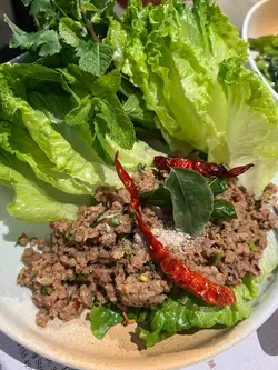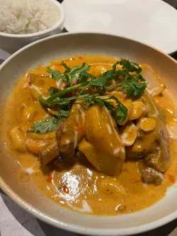 𠮶日喺朗豪坊想食泰国嘢,于是拣咗呢间餐厅,点咗佢嘅午餐set。首先上咗咖喱猪肋骨饭,真系几好食。咖喱味道浓郁,香料均衡,而慢煮猪肋骨肉质非常腍,入口即化,搭配香喷喷嘅米饭,好食。仲叫咗个素肉生菜包,口感清新,生菜嘅脆爽配合素肉嘅香味,非常合适,让人感到轻盈又不失满足感。此外,马拉盏炒通菜亦炒得恰到好处,菜脆而不油腻,马拉盏的香气为整道菜增添咗独特风味,唔会过于辛辣,反而令整体味道更为丰富。总体而言,呢次用餐经验相当愉快,无论系咖喱猪肋骨饭、素肉生菜包还是马拉盏炒通菜都几好食。