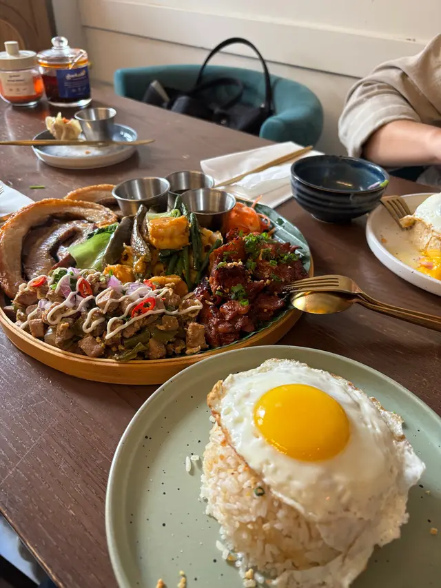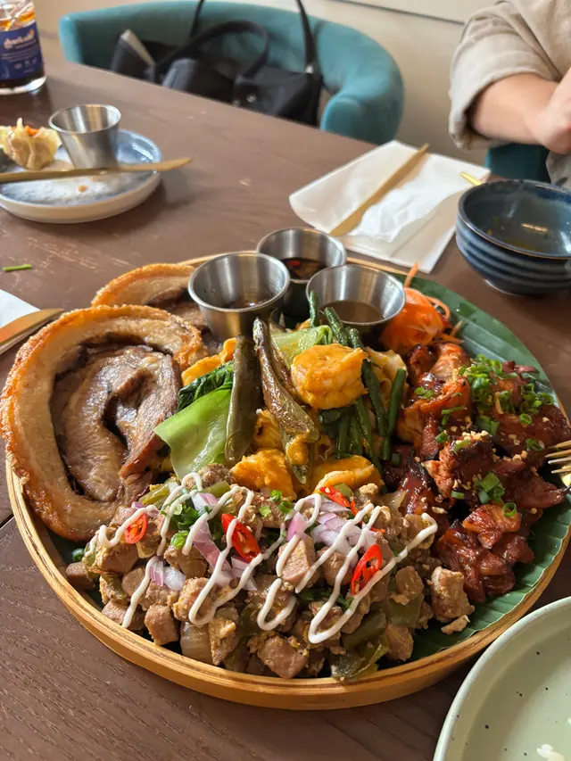 朋友近排好鍾意菲律賓菜 我又未試過於是大家一齊來試呢間餐廳星期六日有人均268嘅brunch set三個人叫左唔同嘅前菜主菜一齊share前菜1: 芒果沙律酸甜清新 就係想像中嘅味道 冇驚喜又冇失望前菜2 菲式柑橘醬油燒賣冇影相 有少少fusion菜嘅感覺但係食落唔覺有咩特別 唔推薦主菜可能因為我哋係share佢用一個大盤裝住配上分別酸酸鹹鹹、甜、好有蝦味嘅醬汁香脆豬五花腩 (左)似燒肉 皮好脆 配埋醬汁幾惹味 同埋應該係菲律賓特色 值得一試蒜香菠蘿雞塊 (右)甜甜哋 幾好食 但就唔特別鐵板吞拿魚 (下)好特別嘅吞拿魚煮法 少少辣但好得意 可以試試分享餐點花生醬燉菜刀削麵 (中)食到最後醬幹曬 pat埋好似一份餅 唔推薦花生醬冇話好特別同埋每人都一碗煎蛋飯 夠曬飽肚甜品芒果提拉米蘇所有野入邊最好食 最驚艷嘅係甜品 入口即融推薦👍…查看更多