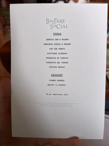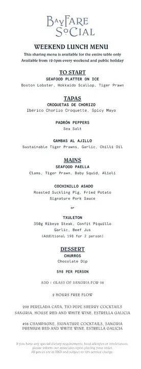 今年E先生的生日,选在尖沙咀瑰丽酒店5楼,充满西班牙风情的西班牙餐厅酒吧海湾聚 Bayfare Social庆祝。踏进Bayfare Social,空间宽敞明亮,户外露台可远眺维港,每一个角落都充满异国欢乐气息。餐厅的西班牙美食从冻盘冰镇海鲜、前菜冻肉芝士沙律、冷热西班牙小食Tapas、以致传统海鲜饭、以及新主厨创意菜式,甜品等……琳瑯满目。我们就点了Weekend Lunch Menu 周末午餐 ( 周末和公众假期中午12时至下午3时供应) $598 / Person,有齐各款美食的套餐。饮品的话,可选 $298 或 $498 两小时任饮,有气泡酒到香槟及多款鸡尾酒;或加点一杯水果酒(Sangria),只需额外 $98。我们就由这杯西班牙经典酒饮开始,以红酒为基底,加入新鲜水果,味道清新、果香酸甜平衡,为今天的美食之旅掀起序幕。开胃菜 波士顿龙虾、北海道带子及黑虎虾冷盘佐以冰镇摆盘精致︰波士顿龙虾鲜味突出;北海道带子佐以酱汁,尤其清新甜美;黑虎虾肉质爽甜弹牙,是一个高质素的开端。前菜 西班牙炸丸子、西班牙帕德隆青椒、西班牙香蒜辣虾三款西班牙小食非常经典,不但色、香、味俱全,而且各具特色。西班牙炸丸子外脆内嫩的炸丸子不油不腻,里面加入伊比利亚猪肉肠碎的内馅柔软,配上辣蛋黄酱提升味觉层次。西班牙香蒜辣虾香蒜虎虾以辣椒油及大蒜浸泡,香辣惹味,鲜虾弹牙爽口。西班牙帕德隆青椒帕德隆青椒味道清甜,简单洒上海盐,咸香且清新解腻。主菜 西班牙海鲜烩饭、烤乳猪 或 350克肉眼牛扒+$198西班牙烤乳猪皮脆肉嫩,配以招牌猪肉汁和入口香脆软糯的炸马铃薯仔,十分吸引。西班牙海鲜烩饭西班牙海鲜烩饭是今餐的亮点之一︰有齐蚬、虎虾、鱿鱼、蒜泥蛋黄酱米饭吸收了各类海鲜精华,口感湿润鲜甜美味。甜品 西班牙油条最后,整餐服务体贴细心的服务员为我们送上附上生日牌的甜品,为我们拍照留念。撒满砂糖的西班牙油条配朱古力酱,外脆内软,加上朱古力酱甜甜蜜蜜,幸福感满满,是完美的甜点结尾。E先生,谢谢你多年的陪伴与带给我的温暖。祝你新的一岁,不念过往,不负当下,不畏将来,努力活好每一天。生日快乐~…查看更多